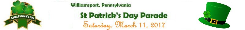 Here in Williamsport, Pennsylvania we are celebrating our 6th annual St Patrick's Day Parade... Saturday, March 11, 2017. The Parade will kick off at the corner of Campbell and Fourth Streets, (use the map above if you aren't familiar with the area), at 2pm. It will march east to Market Street through the heart of downtown Williamsport. The Parade will feature balloons, floats, marching units and bagpipers... wholesome and fun for the entire family. Afterwards visit the downtown shops and restaurants. For those who want to include authentic Irish pubs in their weekend experience you will want to stop anytime of the day at the Shamrock Grill, 762 West 4th Street, (complete with bagpipers and Irish music all day) and Domers Bar and Grill at 1104 Grove Street. FREE Trolleys will be running from 6:00pm through 2:00am to 20 different pubs and restaurants. So what are you waiting for? Get out your green, grab a friend, (or two, or three), and celebrate with us! You can plan your day or your entire weekend by clicking here.